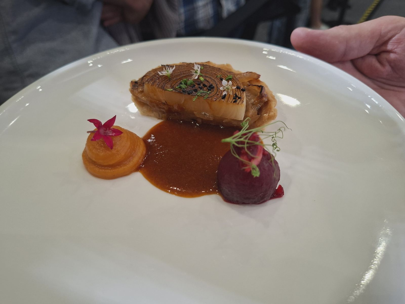 Makói hagymatorta, tormás almával töltött cékla, batáta püré,